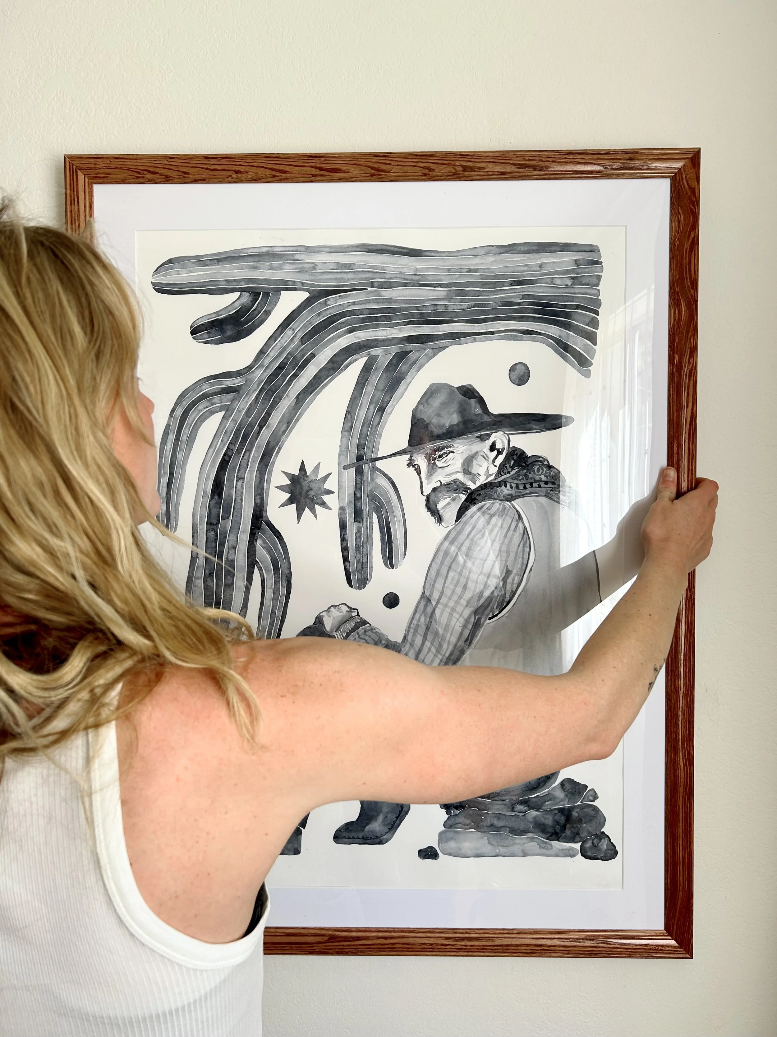 Person hanging a black and white framed artwork on a wall, showcasing a cowboy with a hat, in an artistic style.