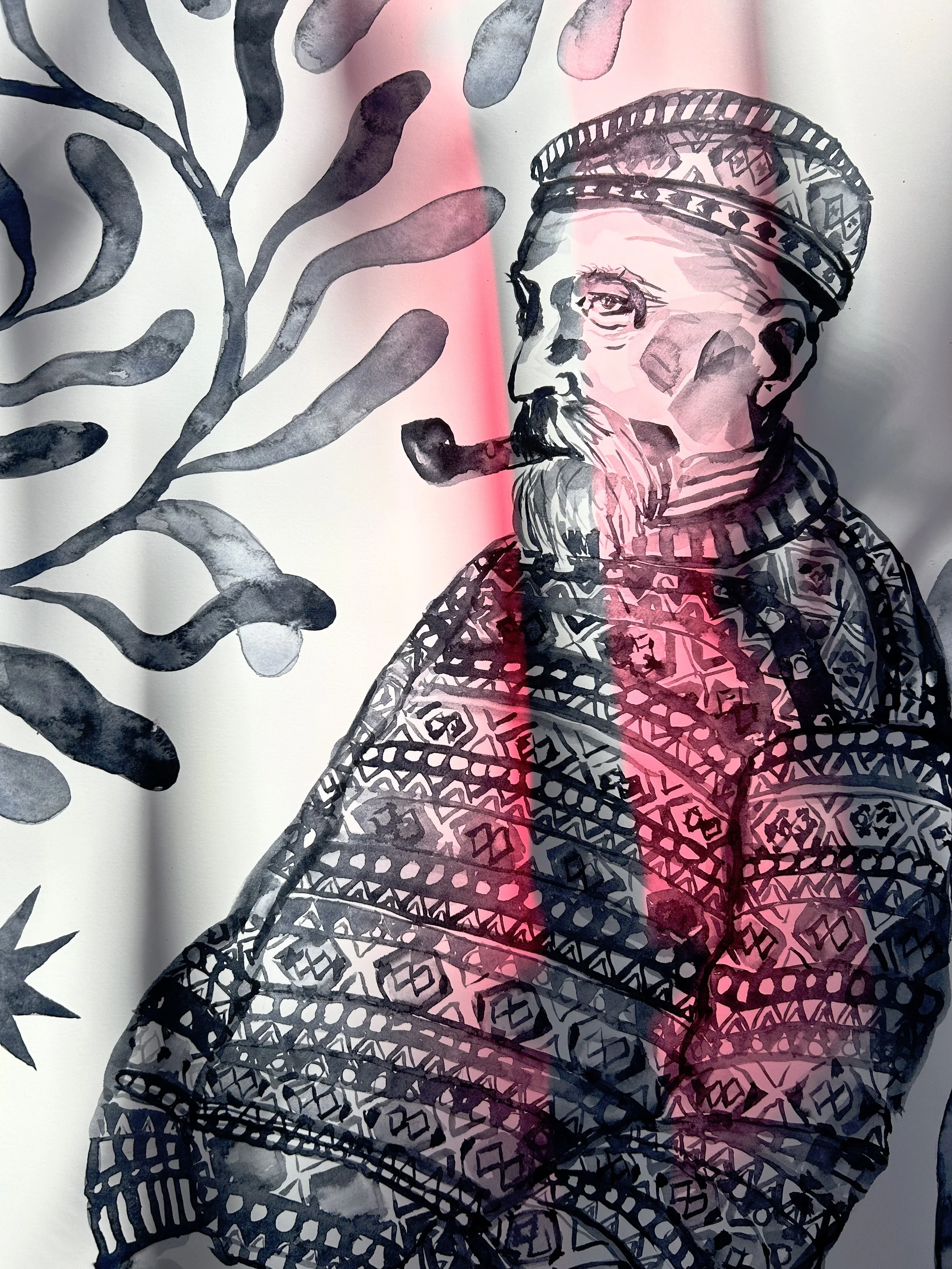 A black and white illustration of a man with a beard and mustache, wearing a patterned sweater and a knit cap, smoking a pipe, with leafy branches in the background.
