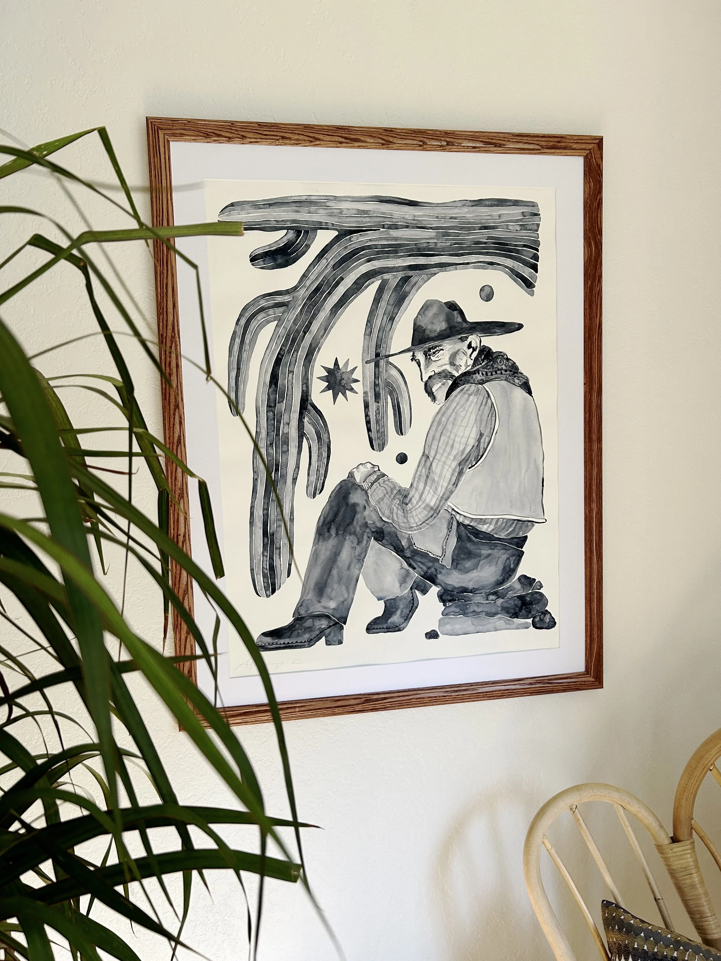A black and white watercolor painting of a man dressed as a cowboy, sitting on rocks with his arms resting on his knees, wearing a hat, glasses, a scarf, a plaid shirt, and a vest. The background features abstract, flowing lines and shapes.